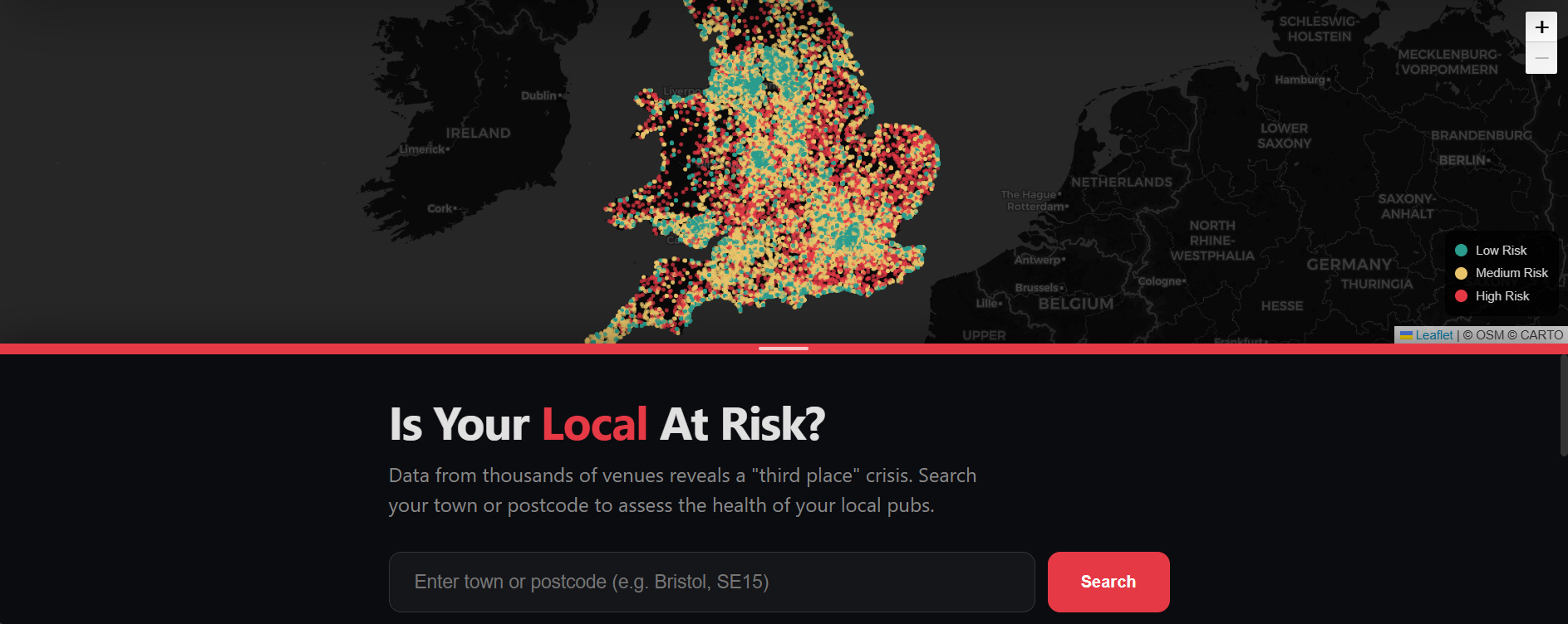 Enter your postcode and see every pub within walking distance, scored green/amber/red by the vulnerability model. The risk scores, not coincidentally, map onto the worst loneliness scores in the ONS wellbeing data.