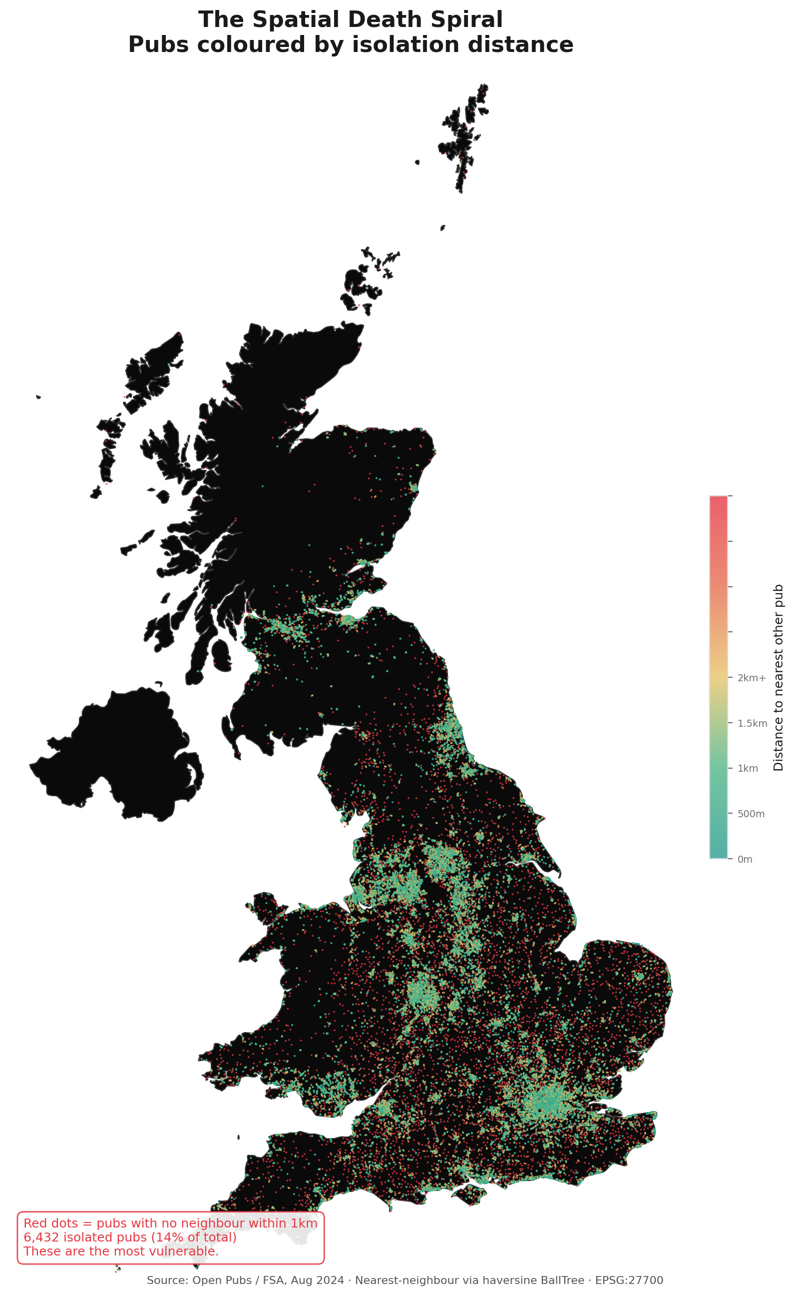 The pattern is as follows: median nearest-neighbour distance for a surviving pub: ~280 metres. For a pub that closed: ~640 metres. Simply said: pubs that were isolated died while pubs in clusters survived. The red dots on the map are the next to go. They are disproportionately rural, disproportionately northern, disproportionately in the same communities that have already lost the most.